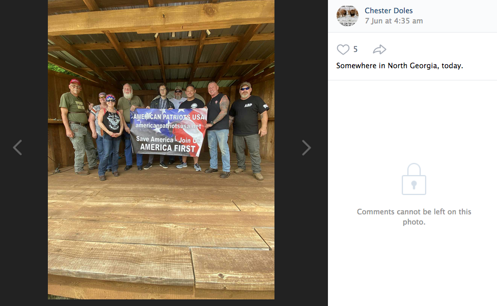 Doles provided more details on APUSA’s interaction with Loeffler in his caption for the photo: “Our VP Josh Mote with Sen. Kelly Loeffler. We had dinner. BLM/Antifa tried to drive her off the stage in Cumming. We showed up at her next few stops. Rest of her day was peaceful.” (See here for background on what happened at the Cumming campaign stop)