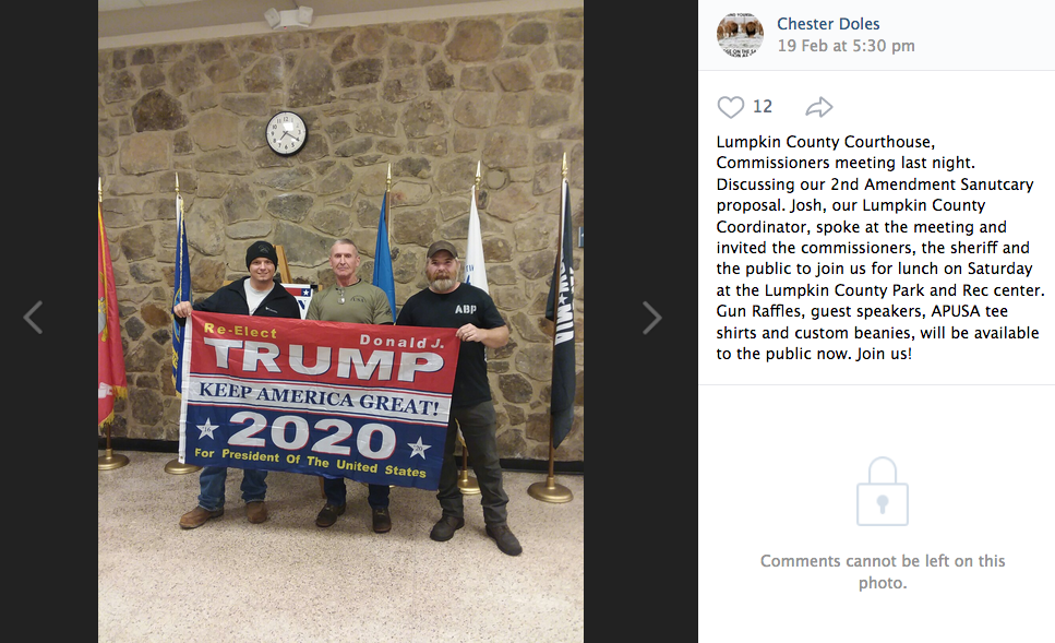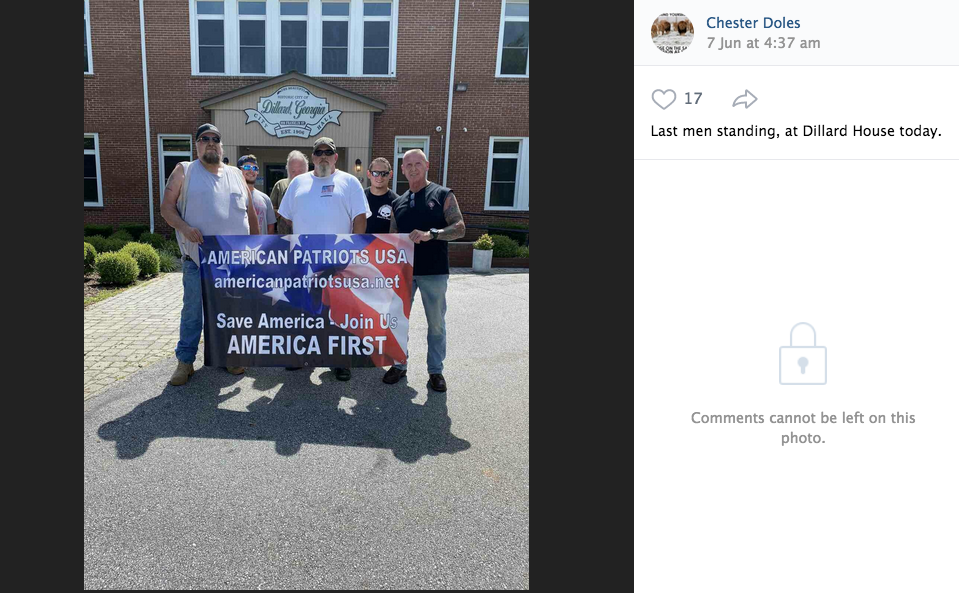 At least two of those 70 people were members of APUSA: The group’s founder and president, Doles, and Vice President / Lumpkin County Coordinator, Joshua Mote. Doles has since told journalist Judd Legum that he was at the event, providing security for Loeffler, and holding an APUSA sign. Mote posed for photos with Sens. Loeffler and Cotton at the event, which Doles subsequently posted on his social media account:
